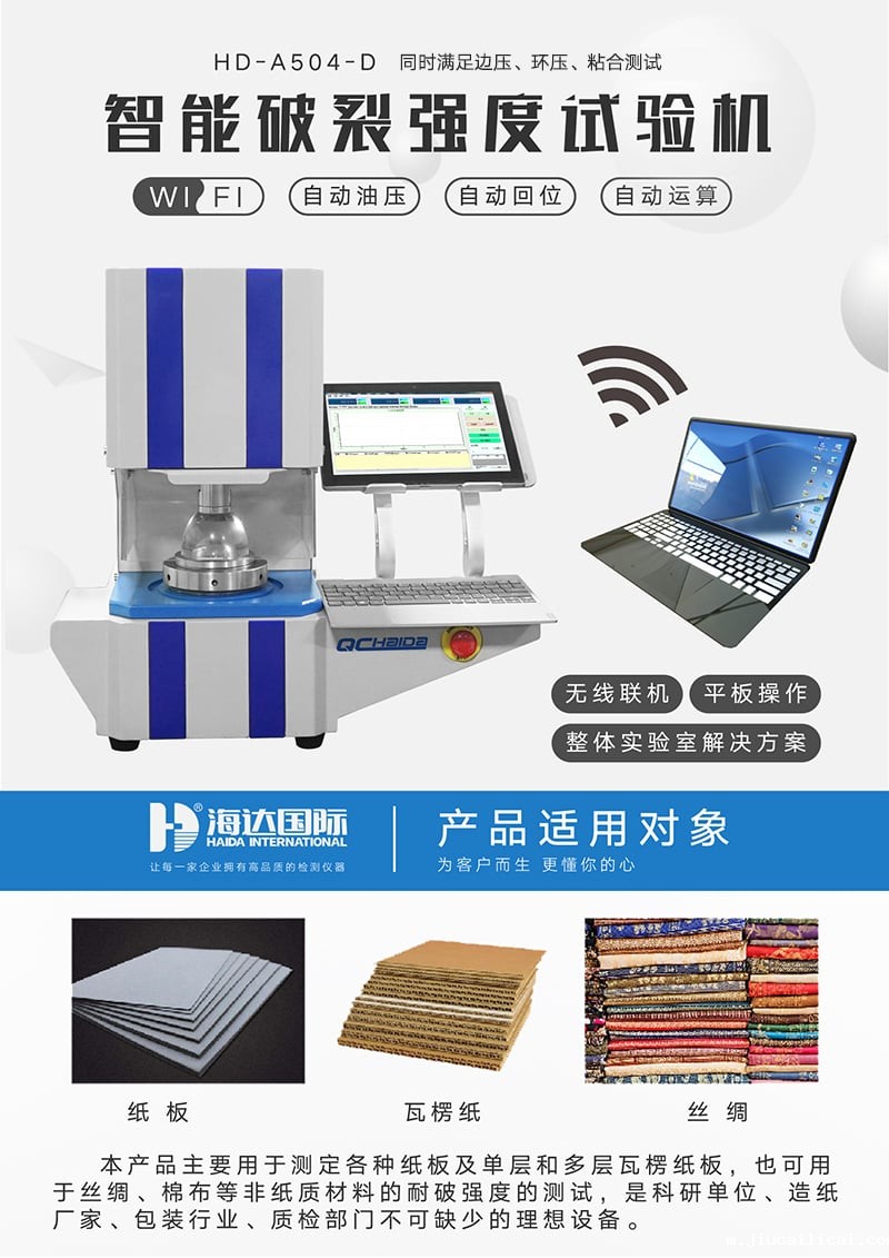 破裂试验机产品介绍:智能纸箱破裂试验机是国际通用型缪纶(Mullen)式仪器是纸和纸板强度性能检测的基本仪器,主要用于测定各种纸板及单层和多层瓦楞纸板,也可用于丝绸、棉布等非纸质材料的耐破强度的测试。本仪器操作简单、性能可靠、技术先进,是科研单位、造纸厂家、包装行业、质检部门不可缺少的理想设备。